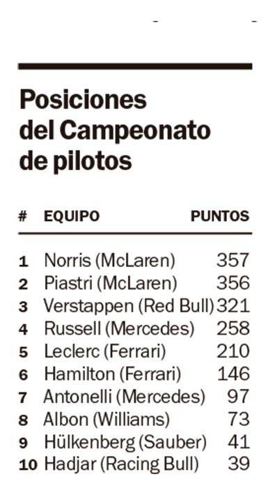 En tanto, el hasta ahora líder del certamen, Oscar Piastri, finalizó en la quinta ubicación de la contienda llevada a cabo en el Autódromo Hermanos Rodríguez, correspondiente a la vigésima jornada del calendario, y pasó a ser escolta.