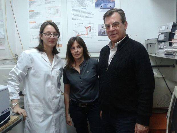 La doctora Alejandra Bosch -en el centro- acompañada por la becaria Cecilia Figoli, y el doctor Osvaldo Yantorno, de la UNLP