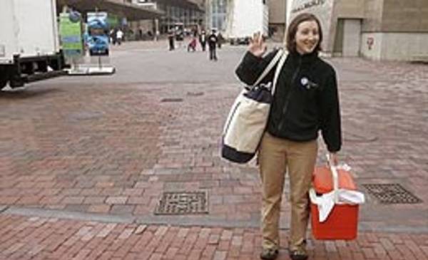 Caitlin Hume, con la heladera que usa para transportar a su bebé pingüino de un lado a otro (AP)