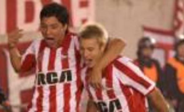 Gastón Fernández festeja junto a Enzo Pérez el primer gol de Estudiantes frente a Libertad. El Pincha se perfila bien en la Copa Libertadores