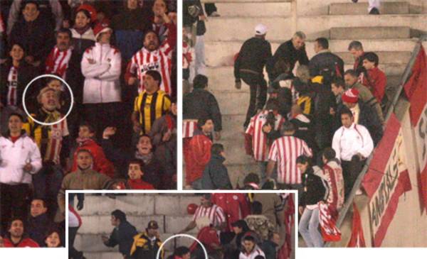 Según Coprosede, el agresor del "Uruguayo" ya estaría identificado y habría utilizado un arma "casera". El hincha, que fue herido durante el partido entre Estudiantes y Nacional, está mejor. Lás imágenesEl Uruguayo en medio de la tribuna (arriba izq). El momento en que lo trasladan herido (arriba der). El que sería el agresor (abajo)