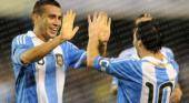Otamendi, que esta en los planes del Malaga, choca las manos con Lionel Messi