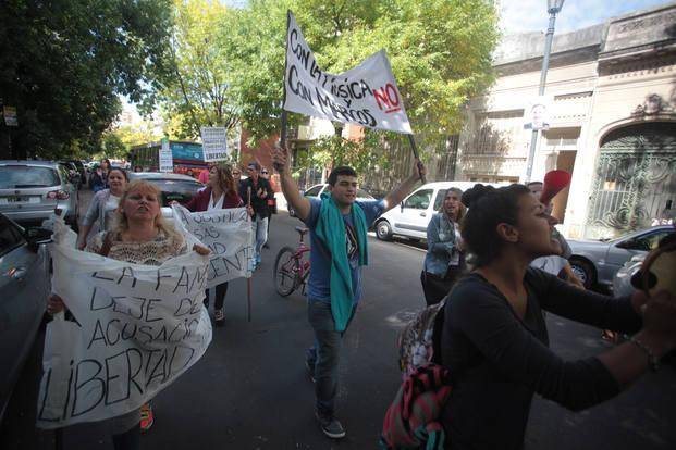 La manifestación a favor del docente comenzó a media mañana y se extendió hasta mediodía, e incluyó una marca con pancartas y banderas en las calles aledañas al edificio judicial, lo que trajo aparejado trastornos viales en ese sector de la ciudad.