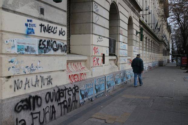Con aerosoles o esténciles las pintadas son una constante en el micro y macrocentro platense; en ocasiones, como es el caso de la facultad de Bellas Artes de la Universidad Nacional, amenazan con tapar murales creados por artistas urbanos especialmente llamados a realizarlos.