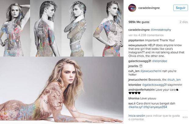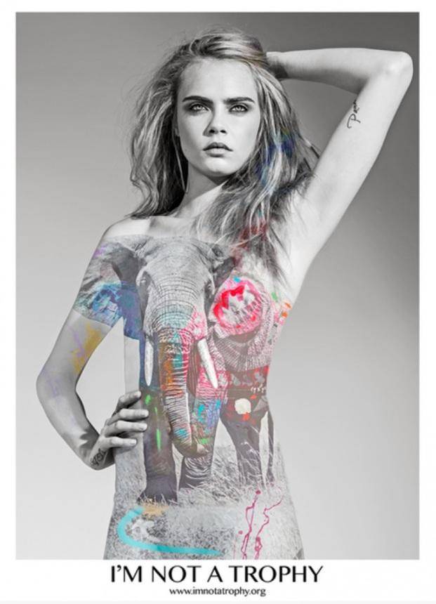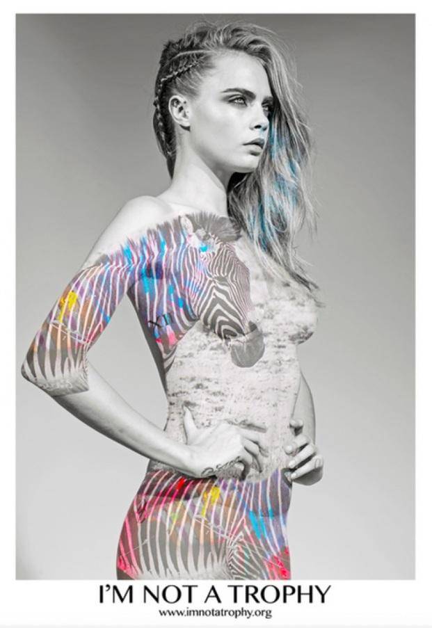 Cara Delevingne, reconocida defensora de los animales, protagonizó una sesión de fotos para una campaña que busca generar conciencia sobre la vida silvestre. La actriz de 23 años participó de la cruzada internacional "I'm Not a Trophy" posando desnuda y dejando su cuerpo expuesto a la proyección de una serie de dibujos.