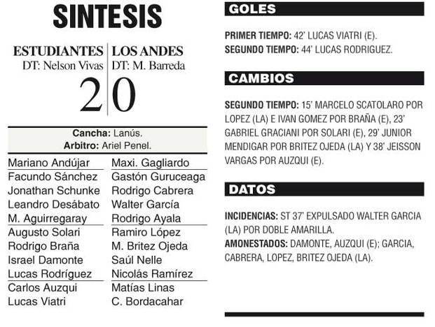 En esos 45 minutos Estudiantes justificó su victoria. Puso arriba de la mesa los atributos de un equipo y otro. Hasta que en el final, luego de un rebote tras un fallido intento de Graciani, llegó el segundo gol, a cargo de Tití Rodríguez, quien junto a Lucas Viatri y Mariano Andújar fue uno de los mejores jugadores de la cancha.