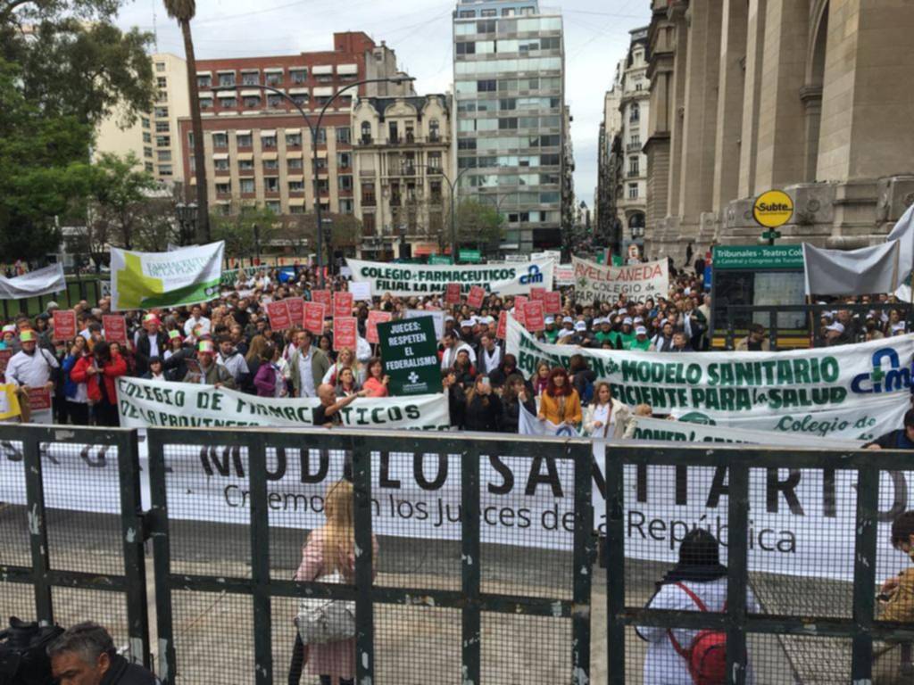 Miles de farmacéuticos realizaron un abrazo simbólico a la Corte Suprema de Justicia nacional para protestar ante la posibilidad de que se instale la cadena Farmacity en la provincia de Buenos Aires.