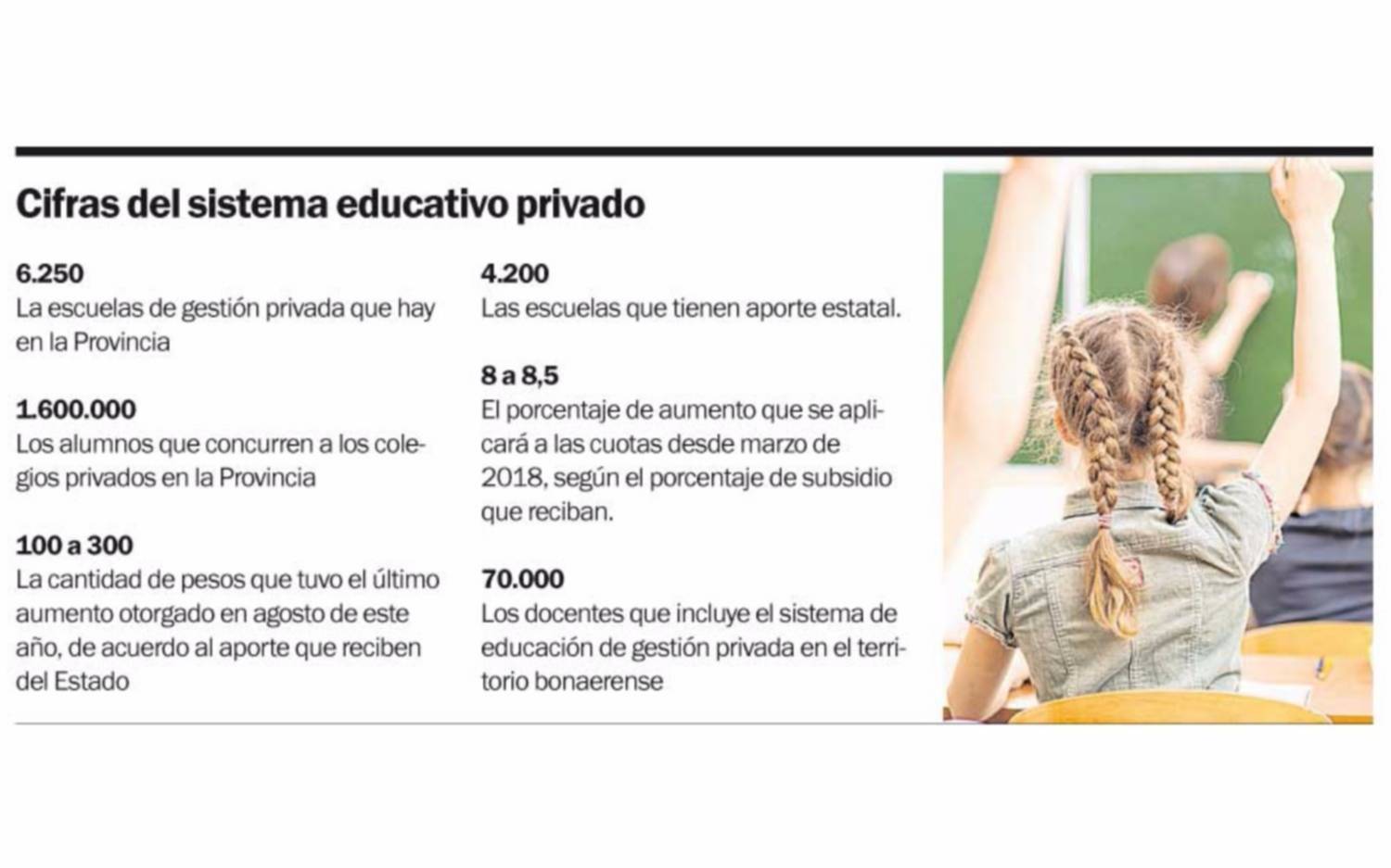 La suba, según se informó, fue consensuada con las asociaciones del sector, va desde un 8 hasta un 8.5 por ciento de acuerdo al subsidio que reciba cada colegio.
