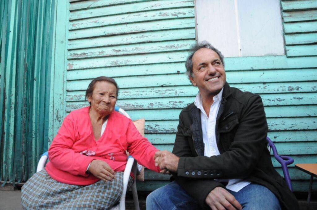 El ex gobernador junto a una mujer identificada como María Rosa, durante su recorrido por Bernal Oeste el sábado. Cree que en la Provincia hubo una revalorización de sus dos mandatos - TWITTER