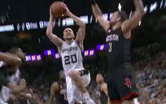 Ginóbili también fue el que dio la asistencia a Green para que pudiese completar la jugada de tres puntos cuando los Rockets estaban arriba en el marcador 106-107 y 30 segundos por jugarse.