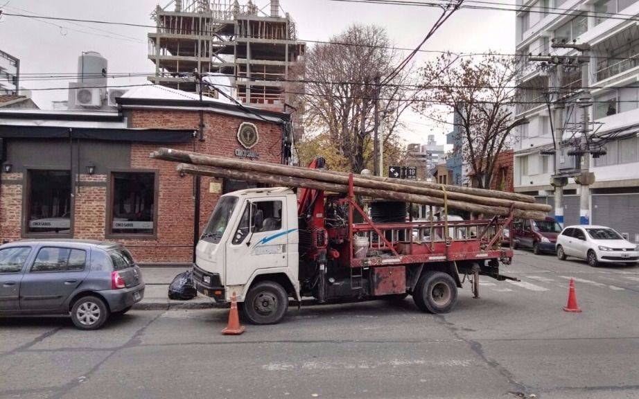 Un camión derribó esta mañana el tendido eléctrico de 19 y 55 y como consecuencia se desprendió la mampostería de un bar situado en esa esquina.