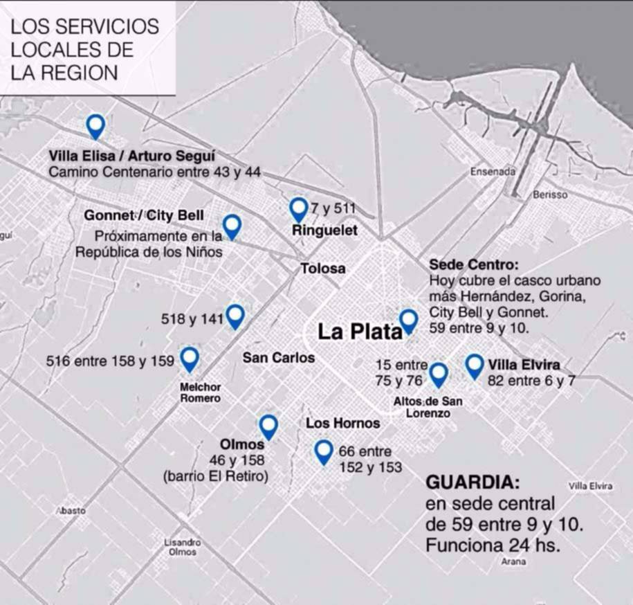 Con tres equipos nucleados en el Centro -pero que trabajan con territorios como Gorina, Hernández, City Bell y Gonnet-, los otros ocho grupos se desempeñan en cada localidad que cubren: San Carlos, Villa Elisa, Olmos, Melchor Romero, Villa Elvira, Altos de San Lorenzo, Los Hornos y Tolosa.
