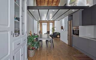 Un espacio bien iluminado fue creado para referirse a la historia industrial de la construcción existente, con pisos de concreto y una estructura de techo al descubierto. Al mismo tiempo, el mobiliario se ha integrado inteligentemente a través de superficies mates. Las zonas de cocina, comedor y vida conforman una unidad amplia, donde todo el equipo de cocina está cuidadosamente oculto a la vista.