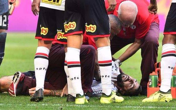El delantero argentino de Sao Paulo de Brasil, Lucas Pratto, está fuera de peligro tras el choque con su compañero Hernanes, quien le pegó un rodillazo en la cabeza, durante un partido contra Palmeiras en un duelo válido por la 22da. jornada del Campeonato Brasileño de 2017.