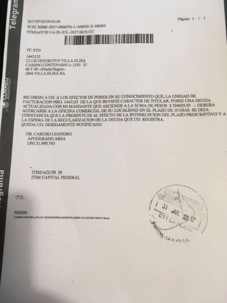El club Deportivo Villa Elisa, de camino Centenario entre 48 y 49, es una de las instituciones de la Ciudad que por estos días recibió la notificación. La nota, que está firmada por el apoderado de Absa, señala que la unidad de facturación de la institución “posee una deuda actualizada con mi mandante que asciende a la suma de $324.655,93. Deberá acercarse a la oficina comercial de su localidad en el plazo de diez días. Se deja constancia que la presente es al efecto de la interrupción del plazo prescriptivo y a la espera de la regularización de la deuda” que la institución registra.