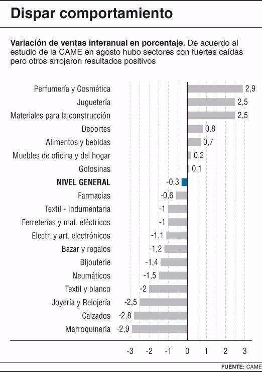 Los sectores que registraron en agosto los aumentos de ventas más significativos en la comparación interanual fueron Perfumería y Cosmética (2,9 por ciento); Jugueterías (2,5 por ciento); y Materiales para la construcción (2,5 por ciento). En cambio, siguieron verificando derrumbes anuales fuertes los rubros Marroquinería (2,9 por ciento) y Calzados (2,8 por ciento).