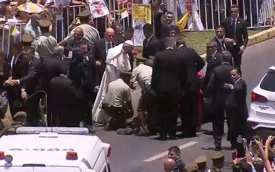 Al verlo, Jorge Bergoglio pidió frenar el vehículo abierto en el que se trasladaba y bajó inmediatamente a ver qué le había pasado y le dio sus "palabras de consuelo", explicó el vocero papal Greg Burke tras el incidente.
