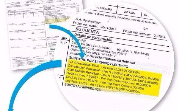 Cada factura eléctrica incluye dos tipos de cargos: los energéticos, vinculados con el consumo (fijos o variables dependiendo del período y la categoría del usuario) y los tributarios, según lo dispuesto por cada jurisdicción. En nuestra provincia, éstos incluyen el IVA (21 por ciento); la Contribución Provincial Decreto Nº1795/92 (0,64 %); la Contribución Municipal Decreto Nº1795/92 (6,42 %), el Decreto Ley 7290/67 (10 %), el Decreto Ley 9038/78 (5,5%) y la Ley Provincial 11769 (5%).