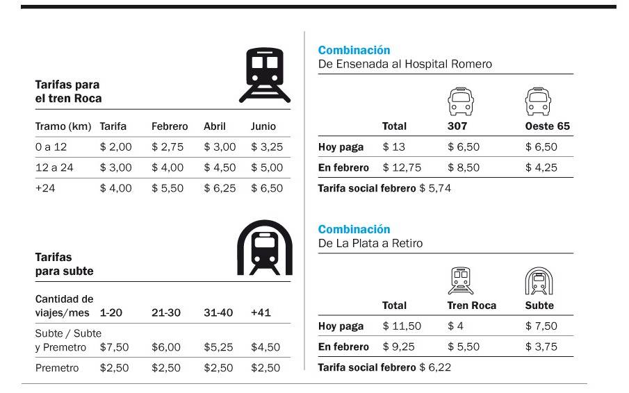 En febrero pasará de $6 a $8, y en abril a 9 pesos. El tren, de $4 a $5,50 de La Plata a Constitución y a mitad de año aumentará a $6,50. Rebajas de hasta el 75% para los que más viajen en un plazo de 2 horas