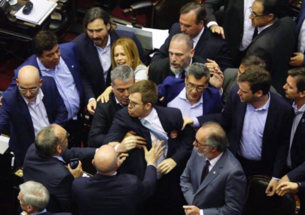 En un ambiente de tensión, el macrista Nicolas Massot y el kirchnerista Daniel Filmus debieron ser separados en medio del tumulto que sucedía en el sector de bancas donde se sientan los legisladores oficialistas.