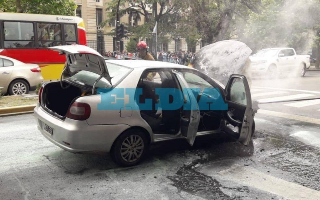 Momentos de tensión se vivieron este mediodía en 1 y 48. Cerca de las 12 un auto Fiat Siena se prendió fuego y el susto se apoderó del barrio, sobre todo porque es una zona y un horario en el que muchos chicos del Colegio Nacional entran y salen del establecimiento educativo, como así también hay mucha actividad de jóvenes que concurren a las distintas facultades de la zona.