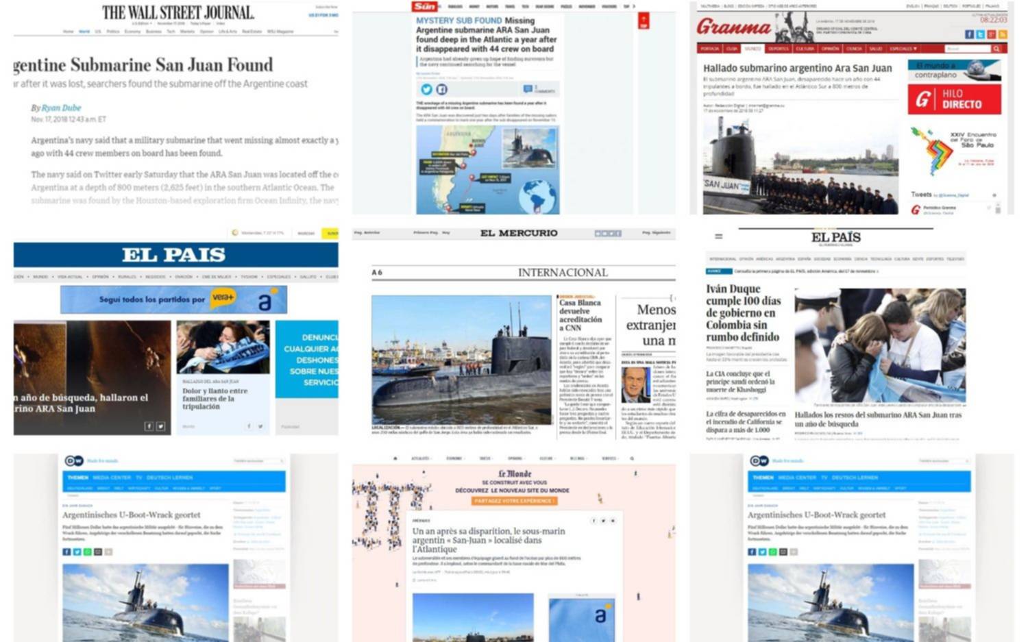 Medios del mundo dedicaron hoy espacio en sus ediciones en papel y versiones on-line al hallazgo del ARA San Juan, el submarino que había desaparecido mientras operaba en el mar argentino el 15 de noviembre de 2017.