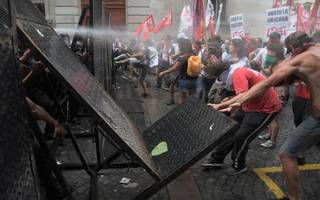 El agua de la fuente de la esquina de Perú y Diagonal Norte, en la ciudad de Buenos Aires, ayer estaba teñida de rojo. La “picardía” fue ejecutada, entre otros, por un joven con delantal de docente, pero con el rostro tapado. Minutos antes, ese era uno de los docentes que intentaba derribar a las patadas un vallado policial para intentar ingresar en la Legislatura, donde se debatía el proyecto, finalmente aprobado, del UniCABA. Dicenque las tropelías que protagonizaron fueron en defensa de la educación pública.