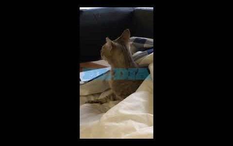 Las imágenes muestran el preciso instante en que el gatito se despierta de su reparadora siesta y tras los temblores la reacción de susto y desconcierto del animalito.