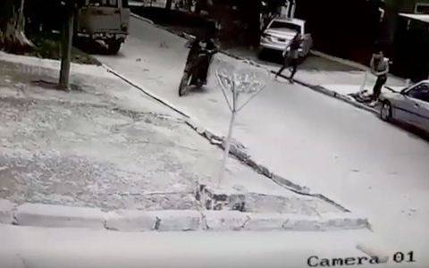 En tomas desde dos ángulos puede observarse cómo el joven señalado como motochorro frena a mitad de cuadra, deja la moto y camina hacia la vereda, cada vez con el paso más rápido hasta salir de pantalla. Unos segundos más tarde vuelve a aparecer, escapando de Micaela (24) y Romina (21).