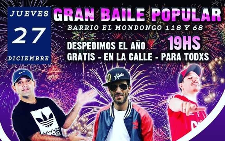 La convocatoria a través de las redes sociales y también por WhatsApp invita a un "Gran Baile Popular" para "despedir el año gratis en la calle". La cita es mañana jueves, desde las 19hs., en 118 y 68, con bandas de música contratadas como "Redoblamos la apuesta", "La Repandilla" y "Agua sucia y los mareados", entre otros, además de un DJ y gente a cargo de la conducción.