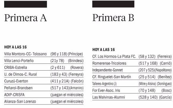 En esta primera fecha, habrá dos partidos que fueron reprogramados para el miércoles que viene, a las 16. Se trata de ADIP-CRISFA y Nueva Alianza-San Lorenzo de Villa Castells.