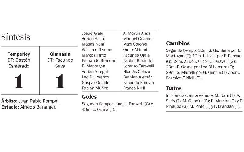 Y ante la obligación, el conjunto Gasolero dominó los primeros minutos frente a un Gimnasia y Esgrima La Plata que no estuvo cómodo, no logró ejercer la presión alta, característica deseada por su entrenador y no tuvo control del juego en toda la primera mitad. De esta manera, y ante un elenco local urgido por los tres puntos, el Lobo vio cómo los de Gastón Esmerado manejaron el ritmo de las acciones, llevando peligro al arco de Alexis Martín Arias, desde los pies de un muy movedizo Fernando Brandán. Temperley mostró más decisión, y con la urgencia como motor, estuvo más claro con el balón, mientras que Gimnasia deambuló en el campo y sólo logró acercarse a los tres palos defendidos por Josué Ayala mediante las distintas pelotas paradas. Así llegó la única clara del tripero en los 45 minutos iniciales. Maximiliano Coronel conectó un tiro libre ejecutado por Facundo Pereyra que se fue cerca del palo izquierdo del ex Boca e Independiente Rivadavia de Mendoza. Los de Esmerado respondieron con un cabezazo del mencionado Brandán, que el arquero mens sana sacó por arriba del horizontal, en la chance más peligrosa del cotejo, hasta entonces. Con un equipo local que fue más que el tripero, Pompei decretó el cierre de la primera mitad.