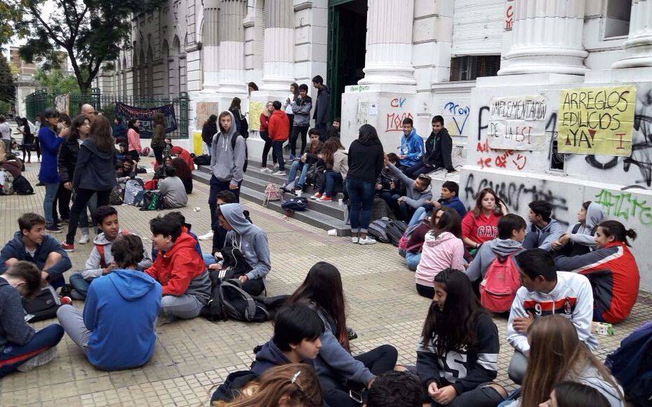 Un nutrido grupo de alumnos del colegio Normal 1 realizaban esta mañana una sentada para exigir mejoras edilicias y en solidaridad con el reclamo de los docentes por mejores condiciones salariales.