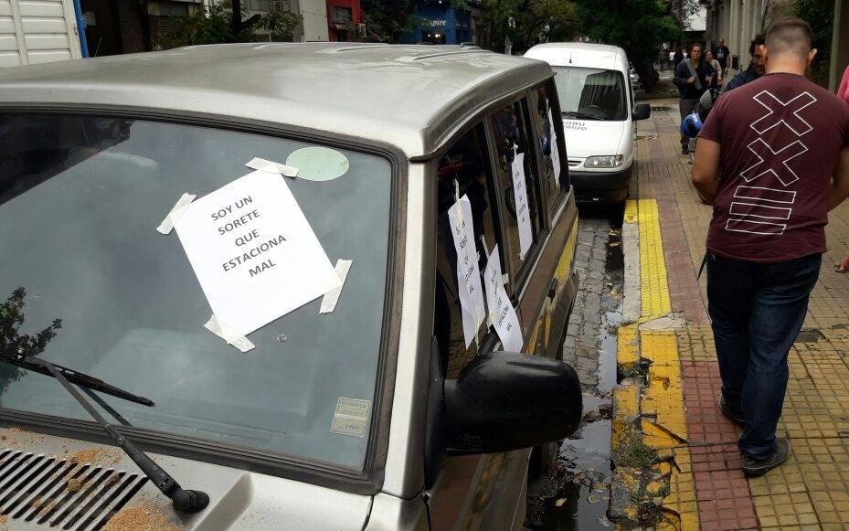 "Soy un sorete que estaciona mal", se podía leer en algunos carteles pegados en varios lugares del vehículo.
