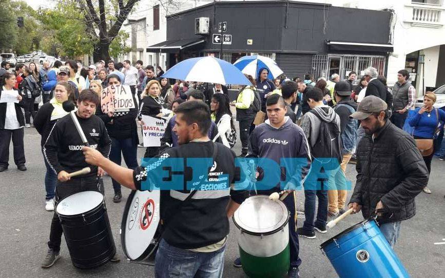 Alrededor de cien trabajadores se apostaron esta mañana en la esquina de 20 y 50 con pancartas y banderas con consignas en contra del cesanteo de personal que -consignaron- lleva muchos años trabajando en dicha repartición.