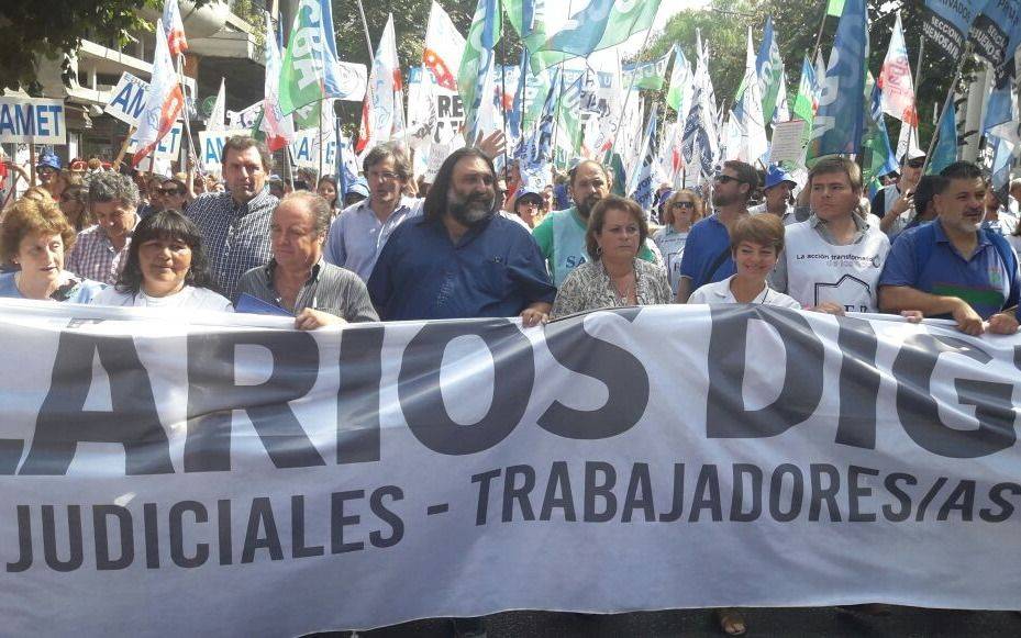 Esas centrales obreras realizaron una marcha conjunta a la Gobernación tras concentrar en Plaza Italia por "paritarias sin techo y en rechazo al 15 por ciento de aumento en cuotas, en defensa del IOMA y del IPS, y por mayor presupuesto en salud, educación, justicia y niñez".