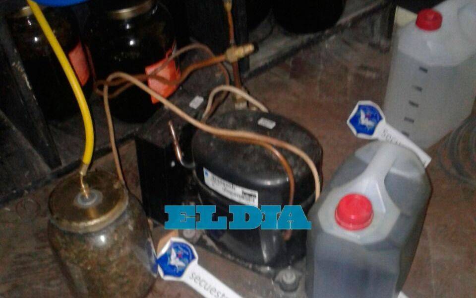 Durante el allanamiento realizado en una propiedad ubicada en 69 entre 2 y 3, los investigadores procedieron al secuestro de 5 kilos de marihuana, 6 kilos de flores de marihuana, una importante cantidad de frascos de 3,5 litros de aceite de marihuana, una balanza de precisión, los frascos utilizados para fraccionar el aceite, además de un bidón de 5 litros, una botella de 1 litro de aceite de hachís y precursores para elaboración.
