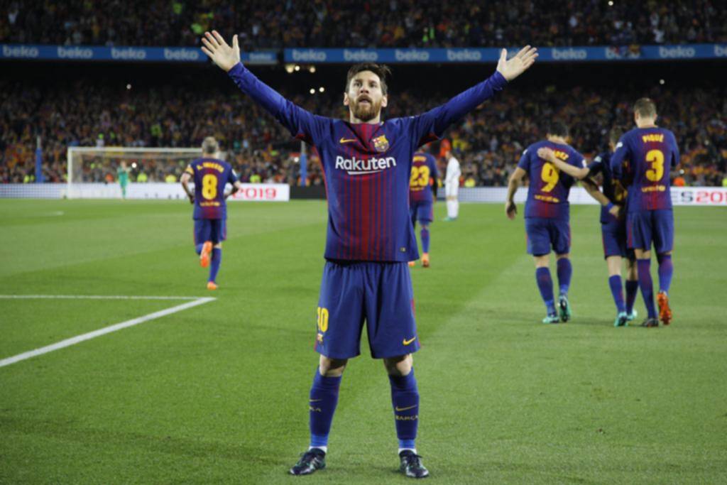 la celebración de Lionel Messi de frente a su público en el estadio Camp Nou. Marcó el 2 a 1, pero luego Real Madrid llegó al empate por Bale / AP