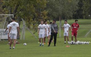 Leandro Benítez dando indicaciones en el entrenamiento junto a su ayudante, Juan Krupoviesa / Roberto Acosta