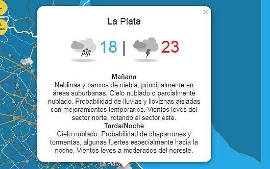Los platenses y la Región vivirán una jornada con cielo nublado, probabilidad de lluvias con mejoramientos temporarios, aunque hacia la tarde se anuncian tormentas, algunas fuertes especialmente hacia la noche, vientos moderados del noreste y una temperatura entre 18 y 23 grados, informó el Servicio Meteorológico Nacional (SMN).