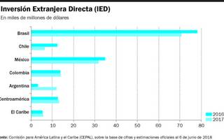 La inversión extranjera directa (IED) en la Argentina se recuperó el año pasado al alcanzar los u$s 11.517 millones, un nivel ligeramente inferior al registrado en 2015, pero que triplica a lo recibido en 2016, indicó un informe de la CEPAL, Sin embargo este tipo de inversió significa sólo el 4% del total recibido en la región. Pese a las buenas cifras, dado que Argentina es uno de los países de la región donde este rumbro más se incrementó, lo cierto es que aún representa apenas algo más de una séptima parte del monto que recibe Brasil y manteniéndose por debajo de México y de Colombia, pero superando a Chile en 2017 cuando en 2016 la economía argentina estaba claramente por debajo de la chilena en este rubro. Argentina recibió en 2017 11.517 millones de dólares, una cifra muy similar a la media del último decenio, pero que representa más del triple de lo recibido el año anterior (+ 257%)”, resaltó el organismo. Tras un 2016 con niveles de inversión directa en mínimos históricos, de u$s 3.260 millones, la Argentina multiplicó por tres la entrada de capitales productivos el año pasado, según el informe.