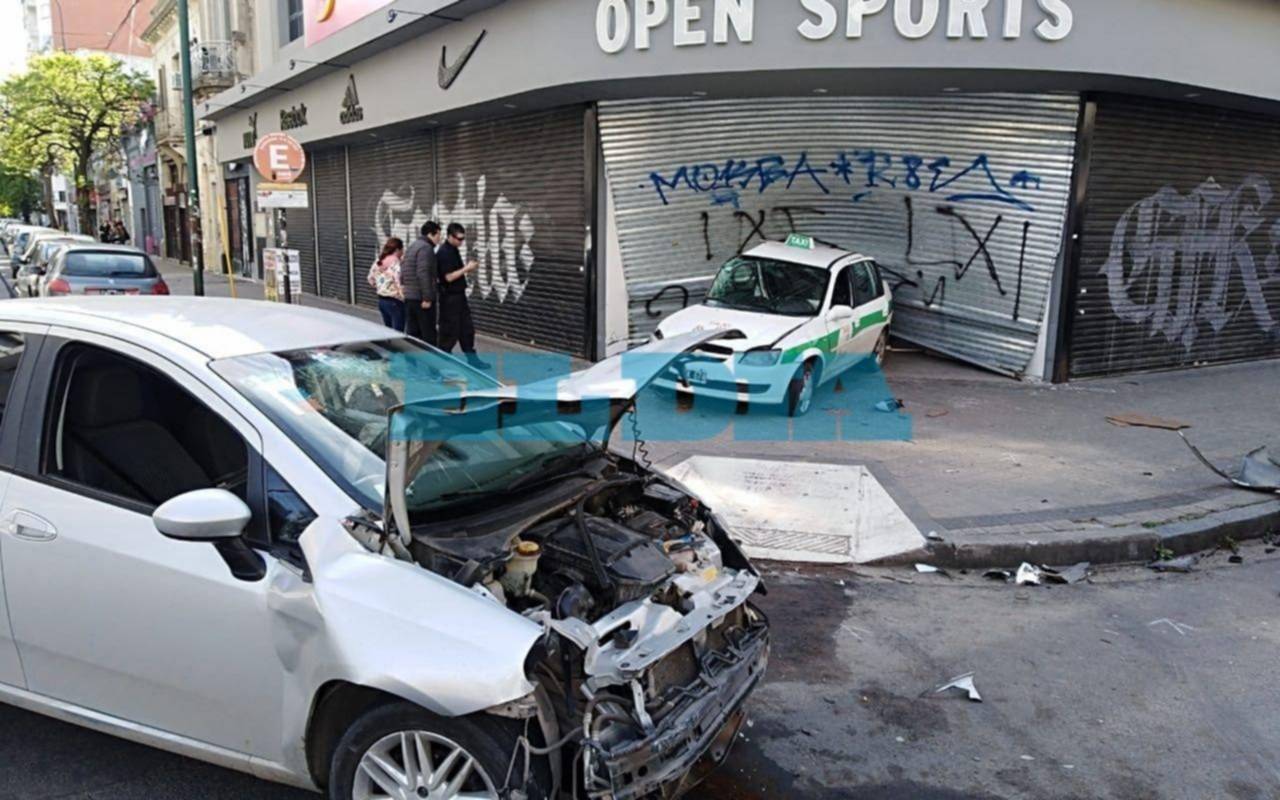 Dos autos, un particular y un taxi, protagonizaron un violento choque esta mañana en la intersección de 5 y 49 y el segundo de ellos se llevó la peor parte al terminar incrustado contra un local de indumentaria deportiva, informaron fuentes policiales.
