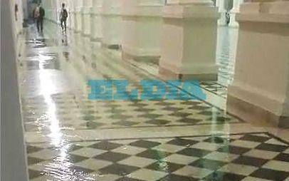 La caudalosa lluvia que se desató esta tarde en la Ciudad causó preocupación en el Pasaje Dardo Rocha, donde se registró una visible filtración de agua que afectó al sector de la plata baja de ese emblemático edificio.