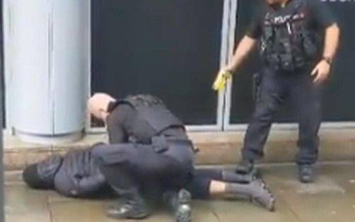 Un video difundido en las redes sociales muestra a un hombre tendido en el suelo en el momento de ser detenido por policías armados, en relación con este suceso.