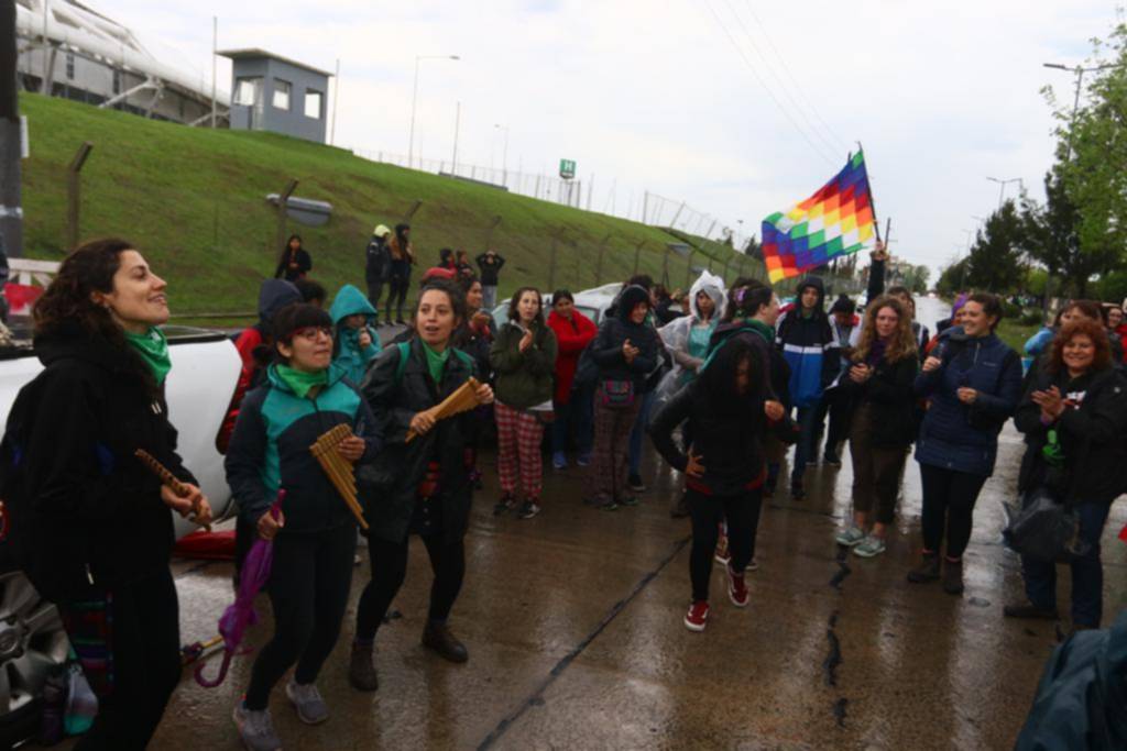 “Esta lluvia de mierda no quiere parar, es el Papa que no para de llorar!”, gritaban encolumnadas bajo una lluvia incesante bajando por 25, algunas protegidas con paraguas multicolores, muchas con capas de lluvia o enfundadas en bolsas de nylon. “Aborto legal en cualquier lugar” o también “Plurinacional, desde Abya Yala hasta Kurdistán”, repetían a medida que avanzaban hasta llegar al camión-escenario montado en el cruce de 529.