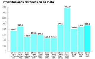 Unos 235 milímetros que cayeron entre el viernes y la tarde de ayer generaron serios anegamientos en distintas zonas de la periferia platense, hubo extensos cortes de luz y se registraron severos daños en el cordón hortícola. La de ayer fue la marca más alta de precipitaciones después de la trágica tormenta de abril de 2013, cuando se habían registrado 392 milímetros. El parte meteorológico marca que para el domingo no se prevén lluvias, pero si fuertes vientos, por lo que bajará la temperatura sensiblemente en las próximas horas.