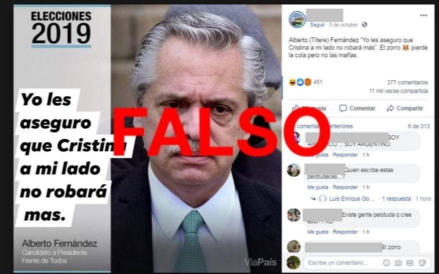 Este medio consultó también al equipo de Prensa de Alberto Fernández: confirmaron que lo que circula en las publicaciones es falso y que el candidato a presidente “nunca dijo eso”.