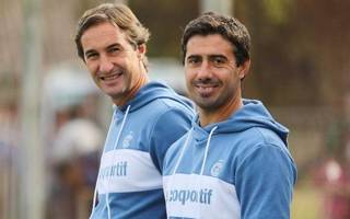 Diego con sus ayudantes, adrián González y Sebastián Méndez, en el predio de la AFA / prensa Gimnasia