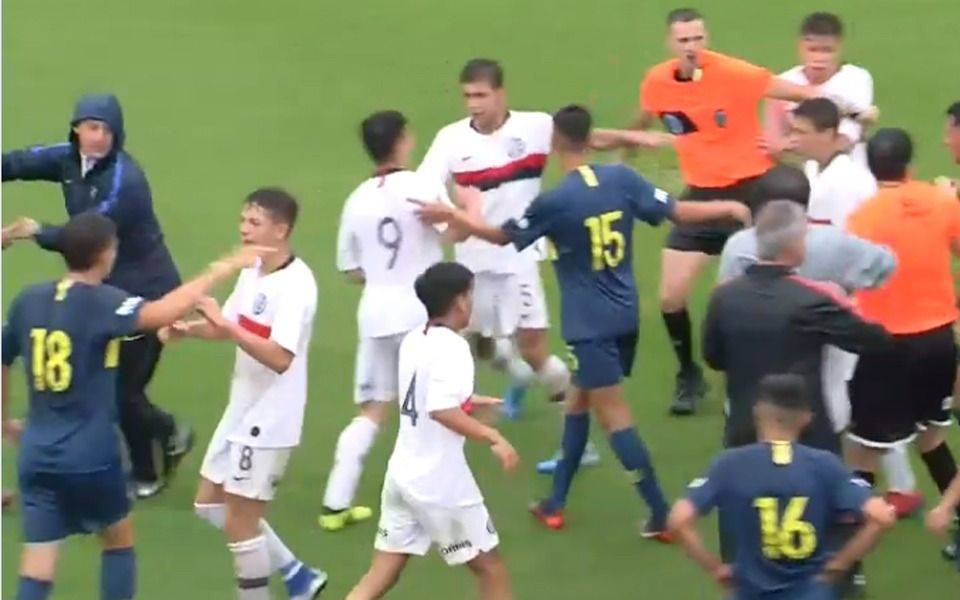 Poco después del gol de Boca, un cruce en la mitad de la cancha terminó con un expulsión, cruces entre todos y el coordinador de las Inferiores cuervas como loco.