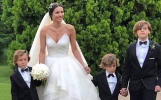 Sin dudas, el momento más movilizante fue el camino hacia el altar de Pampita, entre los jardines del palacio, bien escoltada por sus tres hijos, vestidos todos igual. El novia lucía radiante: eligió un diseño romántico de Gabriel Lage, un vestido strapless escote en v, con falda de cascada, y que completó con velo, tiara y un bello ramo.